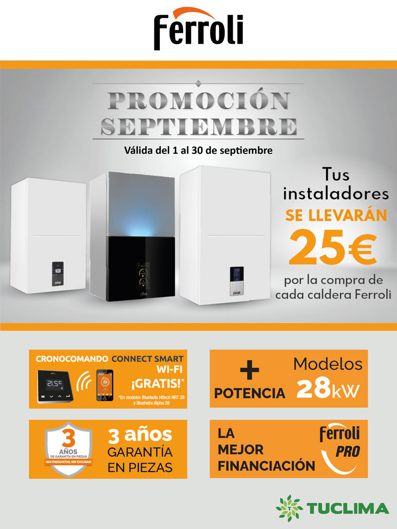 Llévate 25€ de bonificación por la compra de calderas Ferroli del 1 al 30 de septiembre. Promoción exclusiva para instaladores de Ferroli con tarjeta Premium Club. ¡No olvides darte de alta https://ferrolipromoseptiembre.aclonline.es/login_page y registrar los números de serie antes del 31 de octubre de 2022!