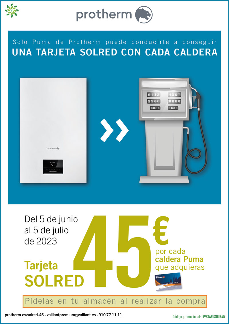 Del 5 de junio al 5 de julio de 2023, con calderas Puma de Protherm llévate una tarjeta de combustible Solred por valor de 45€. Solo tienes que pedírnosla a la hora de realizar la compra. ¡Promoción dirigida al profesional!